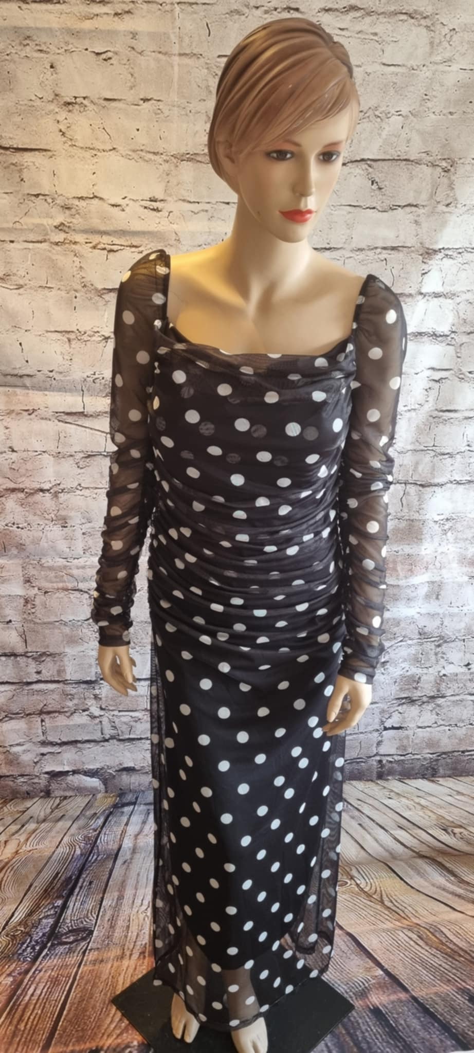 Elegant black midi dress with white polka dots and full-length pleats. It features long sleeves and subtle side gatherings that enhance the silhouette. The dress features built-in soft cups that gently shape and support the bust.  Perfect for evenings out and special occasions.