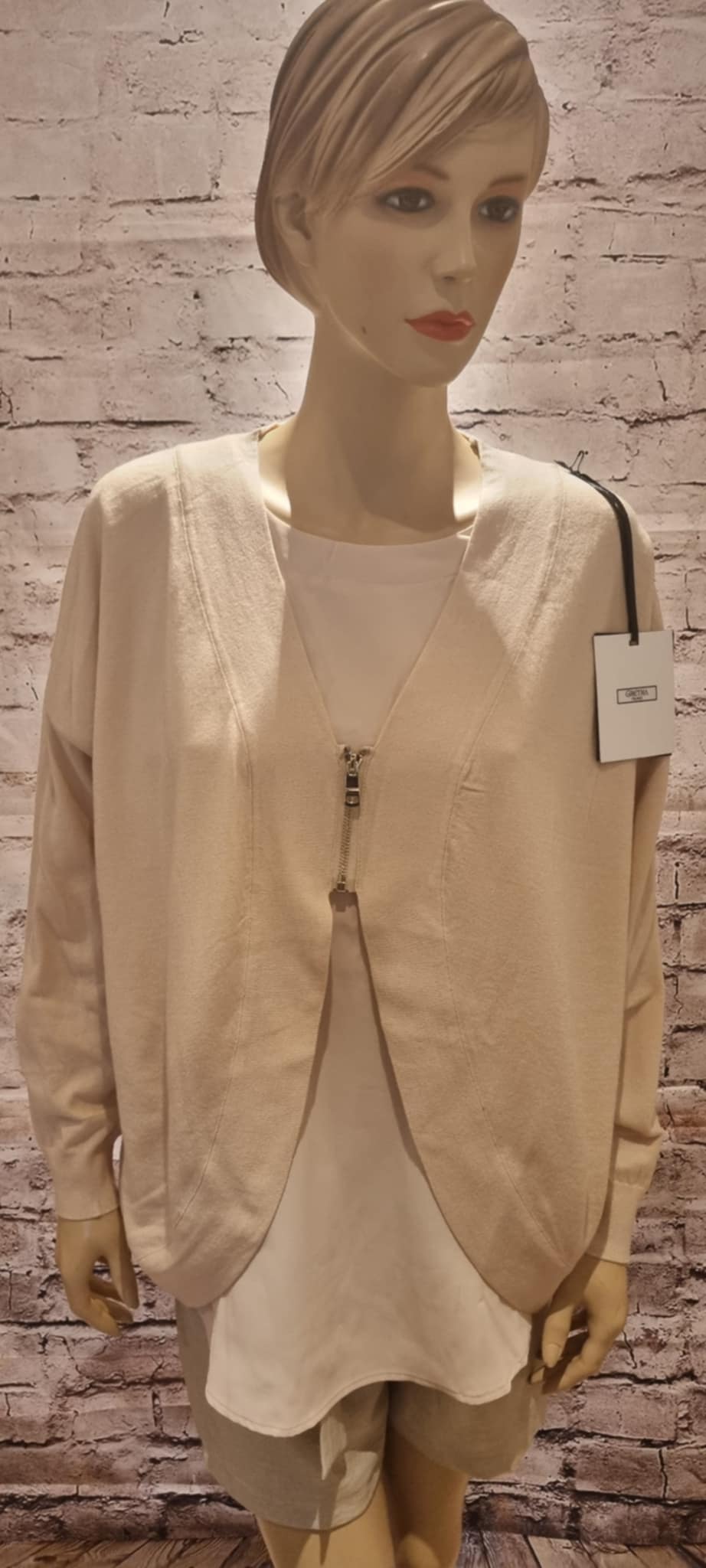 Elegant 2-in-1 design – a knitted cardigan sewn onto a lightweight blouse, creating a ready-made layered look. Soft, flowing fabric drapes beautifully on the silhouette, while the decorative front zipper adds a modern touch. Perfect for trousers, skirts and leggings.