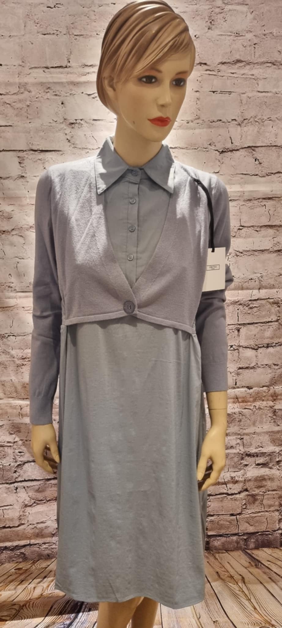Elegant 2-in-1 dress with a sewn-on bolero, creating a cohesive and ready-made outfit. The smooth, flowing base of the dress drapes beautifully on the silhouette, while the short knitted bolero with a button highlights the waist and adds a classic, feminine touch. Perfect for everyday wear as well as more elegant occasions.