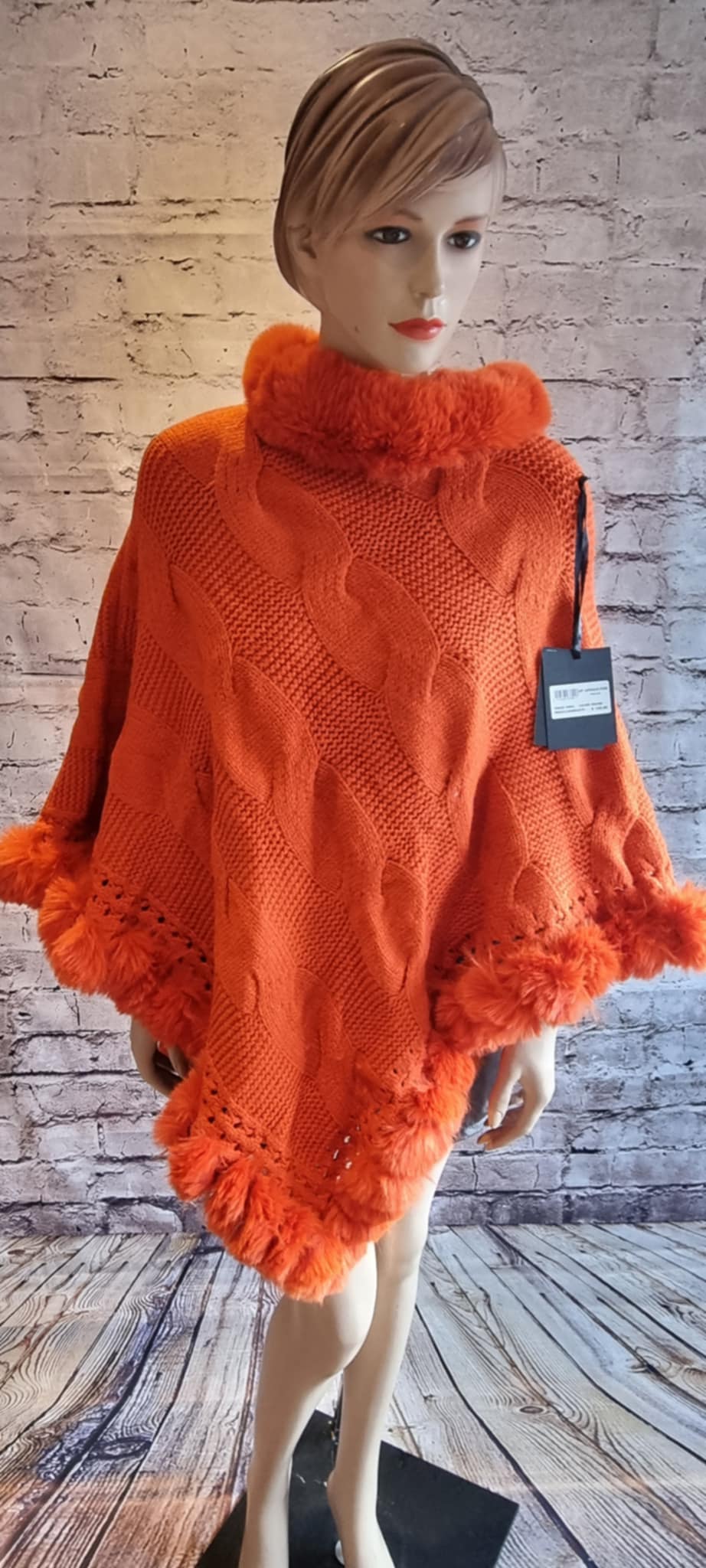 Eleganckie pomarańczowe ponczo z miękkim futrzanym kołnierzem i wykończeniem, idealne na chłodniejsze dni.