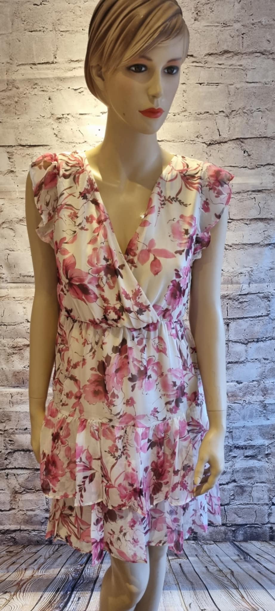 A delicate, airy floral dress with a layered skirt and an above-the-knee length. Crafted from lightweight white fabric with a pink and fuchsia floral print, the dress features a feminine wrap-over V-neck, short ruffled sleeves, and a flowing, layered hem for a romantic touch. An elastic waistband subtly accentuates the waist and ensures a comfortable fit. Perfect for summer outings, garden parties, or a romantic date.