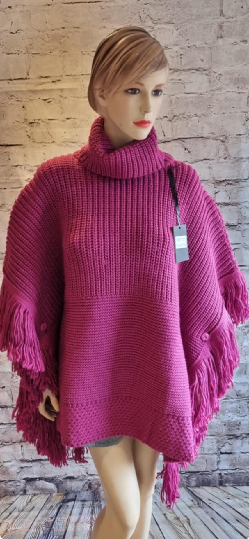 Stylowe ponczo w kolorze fuksji z wysokim kołnierzem, frędzlami i ozdobnym guzikiem na rękawie. Miękkie, ciepłe i wygodne – idealne na jesień i zimę. Idealne zarówno na co dzień, jak i na eleganckie okazje.