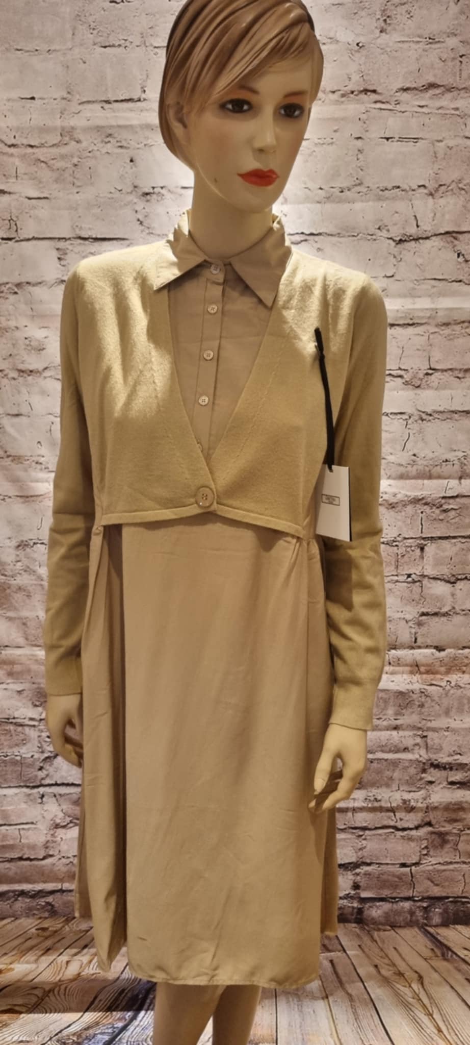 Elegant 2-in-1 dress with a sewn-on bolero in a warm sand shade. The smooth, lightweight base of the dress drapes beautifully on the silhouette, while the short knitted bolero with a button highlights the waist and adds a classic, feminine touch. Perfect for everyday wear, work and elegant occasions.