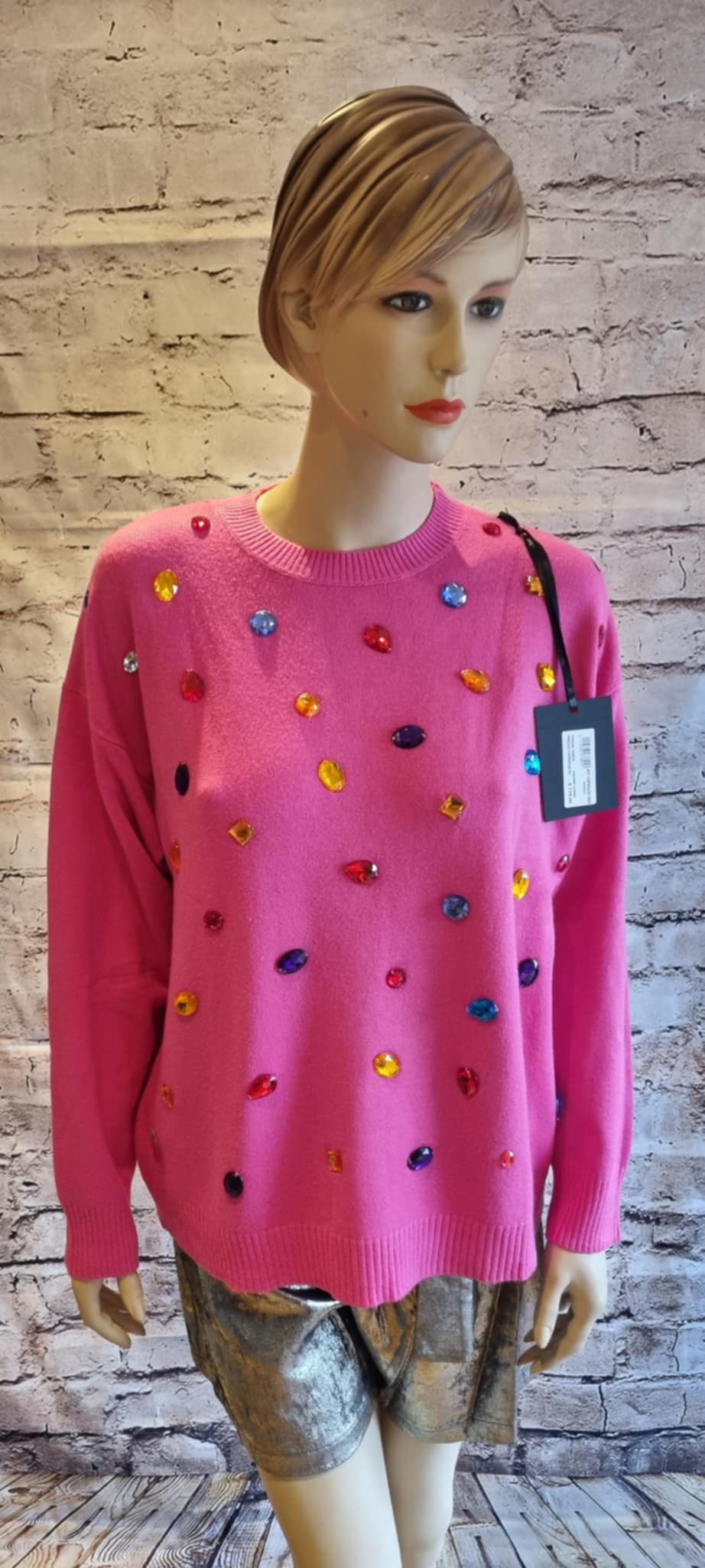A striking fuchsia pink sweater adorned with colorful, sparkling crystals. It features a relaxed fit, a crew neck, and long sleeves for ultimate comfort. Perfect for special occasions when you want to shine and add a touch of glamour to your outfit.
