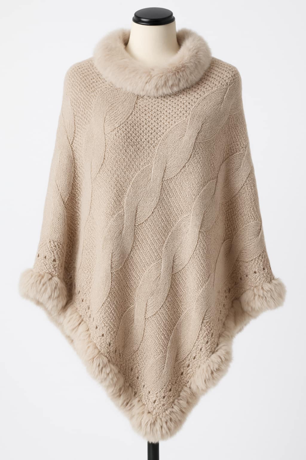 Stylowe beżowe ponczo z miękkiej dzianiny, wykończone eleganckim kołnierzem i obszyciem ze zwykłym futerką. uniwersalny rozmiar – idealny na chłodniejsze dni. Jeden rozmiar.