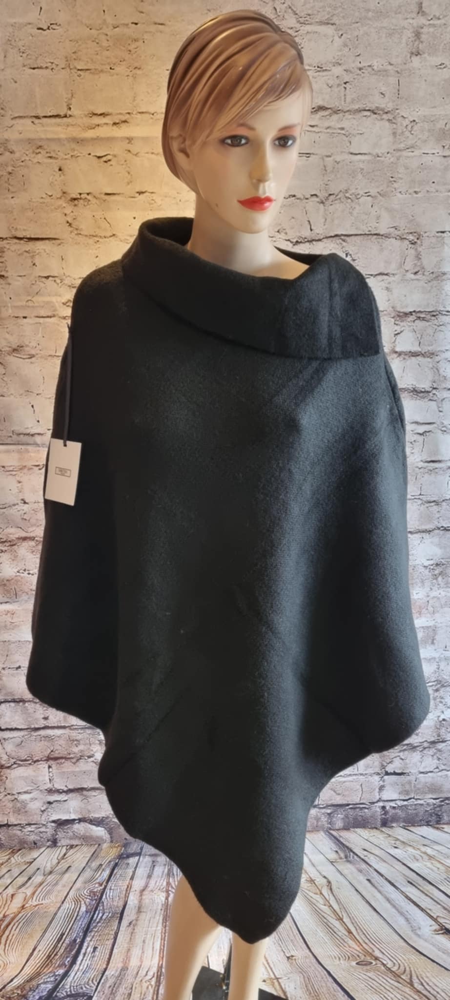 Stylowe czarne ponczo o asymetrycznym kroju, łączące elegancję i wygodę. Wykonane z miękkiej tkaniny, idealne zarówno na co dzień, jak i na specjalne okazje. Ponczo gładko układa się na ciele, nadając mu lekki, nowoczesny wygląd.
