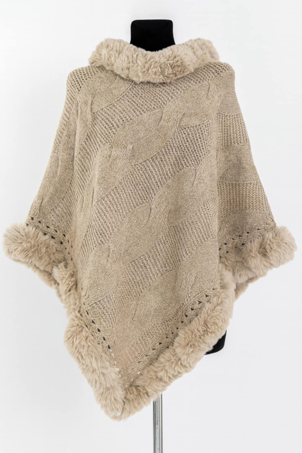 Elegant cappuccino poncho with a soft fur trim. Perfect for cooler days – style and comfort in one.
