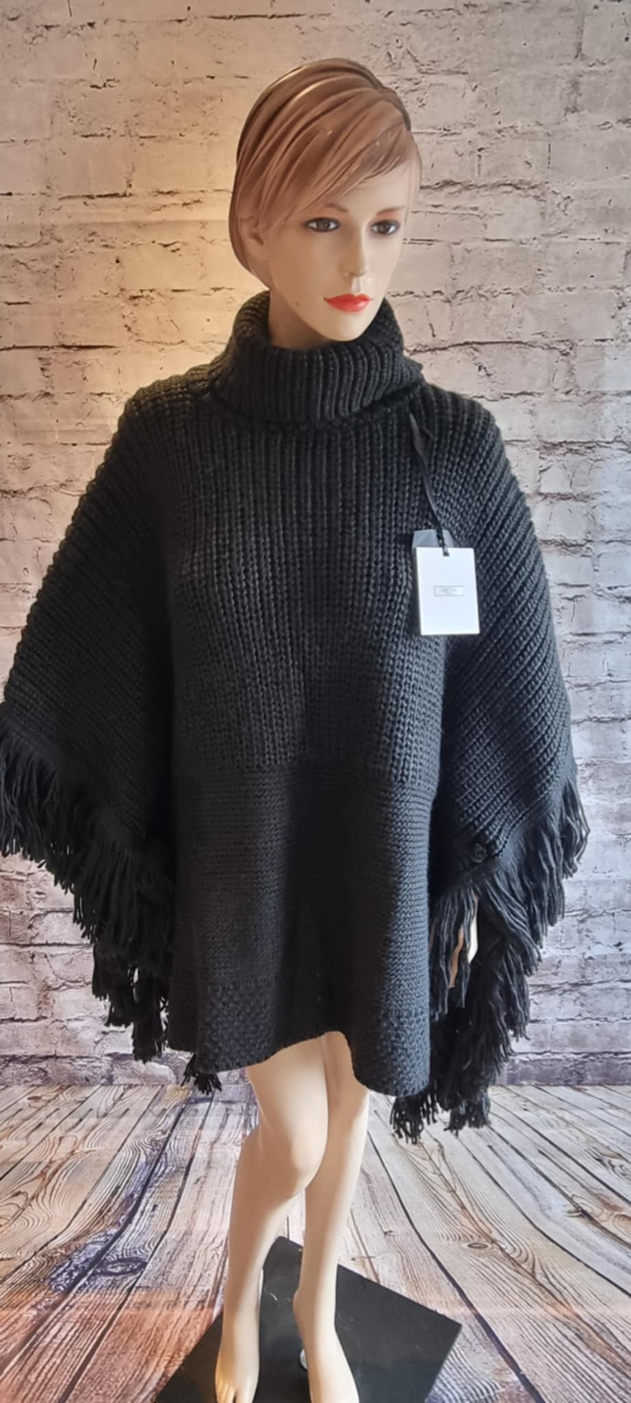 Elegant black poncho with a turtleneck and fringes. Warm and stylish, ideal for cooler days. The buttons on the sides add extra comfort and a fashionable touch.