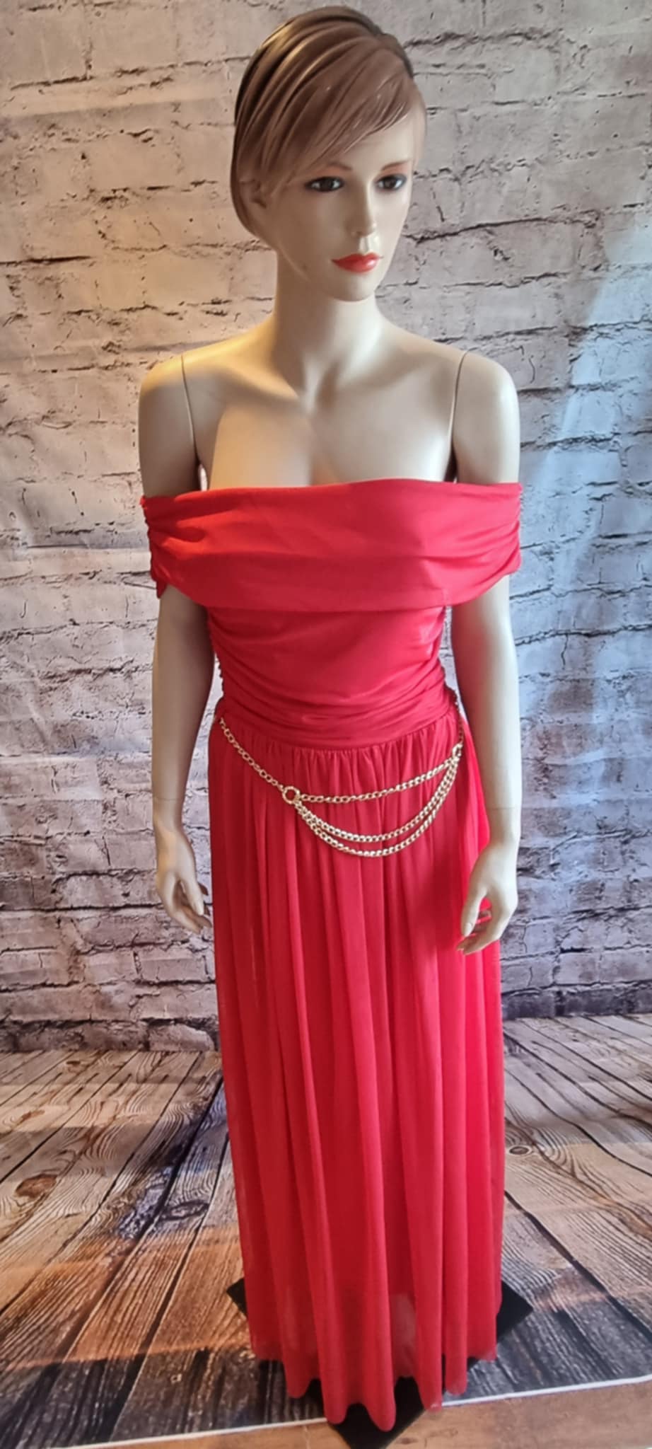 Elegant long dress in vibrant red with an off-the-shoulder design. The bodice features delicate pleats and is accentuated by a gold chain belt that defines the waist. The flowing, lightly pleated skirt adds elegance and refinement. Perfect for evening events and special occasions.