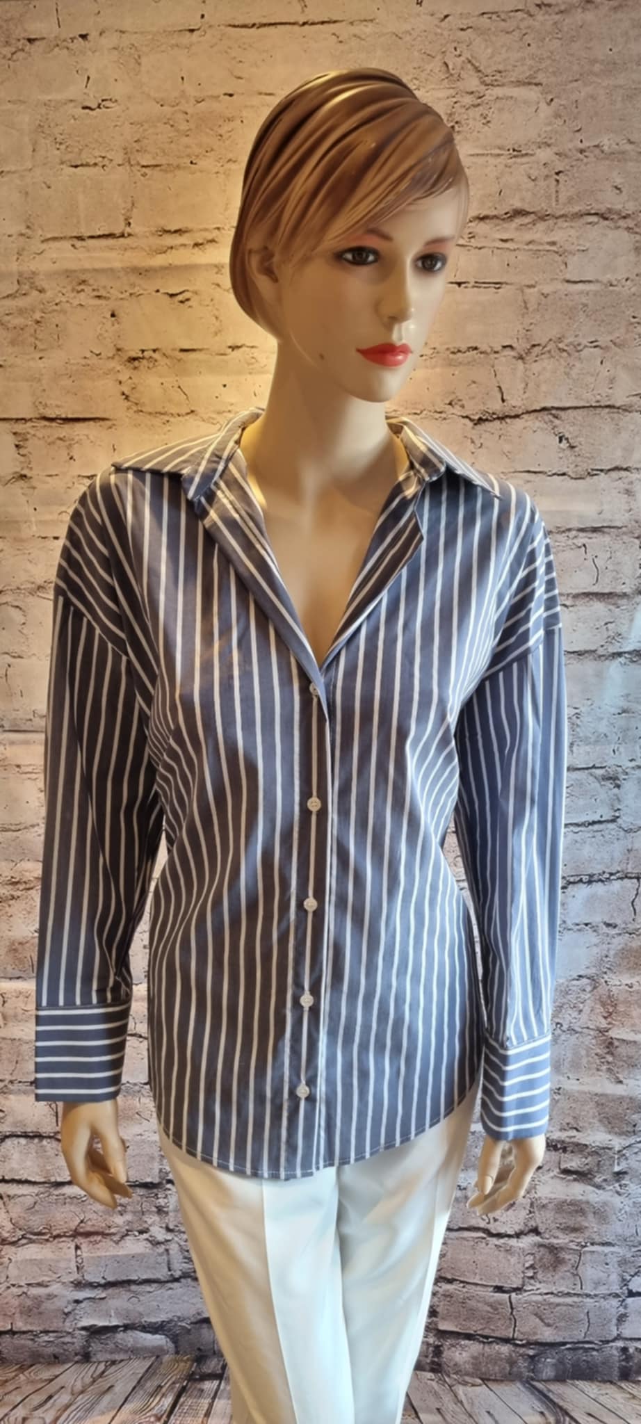 Elegant blue and white striped blouse with a button closure. It features a classic collar and horizontally striped cuffs for a modern look. Perfect for both business and casual outfits.