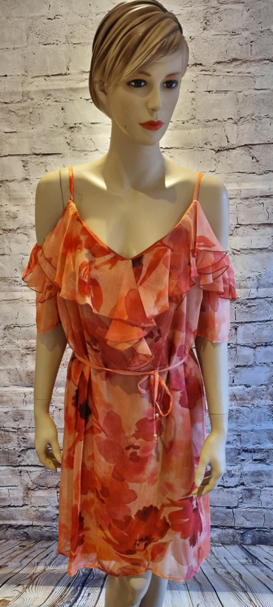 A flowing dress with a feminine silhouette, featuring open shoulders and an eye-catching ruffle at the neckline. Thin straps and a tie belt beautifully highlight the waist. The light, semi-transparent fabric with a floral print makes this dress perfect for summer, holidays and garden parties.