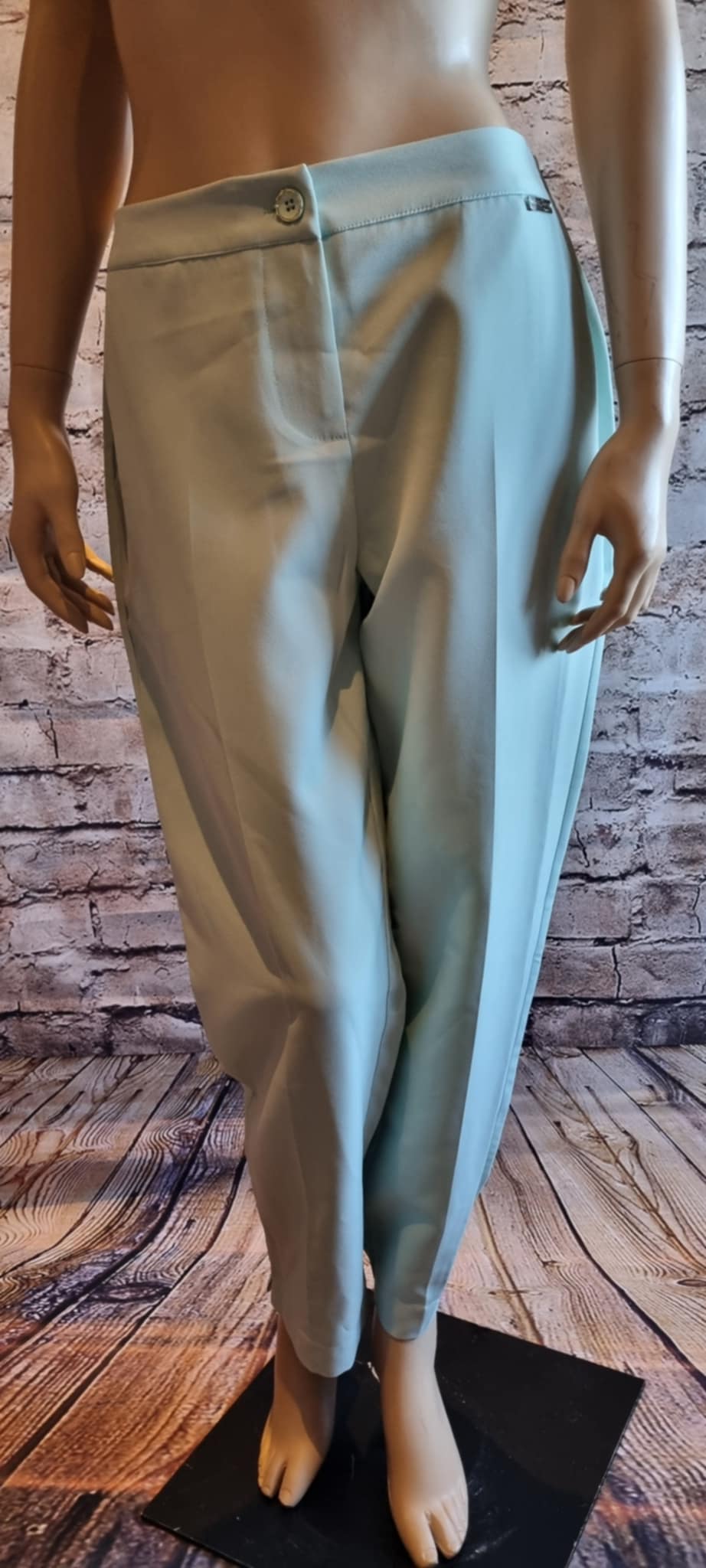 Elegant trousers in a light pastel green shade, fastened with buttons. Slightly flared legs and a classic straight cut make them perfect for both casual and business outfits.