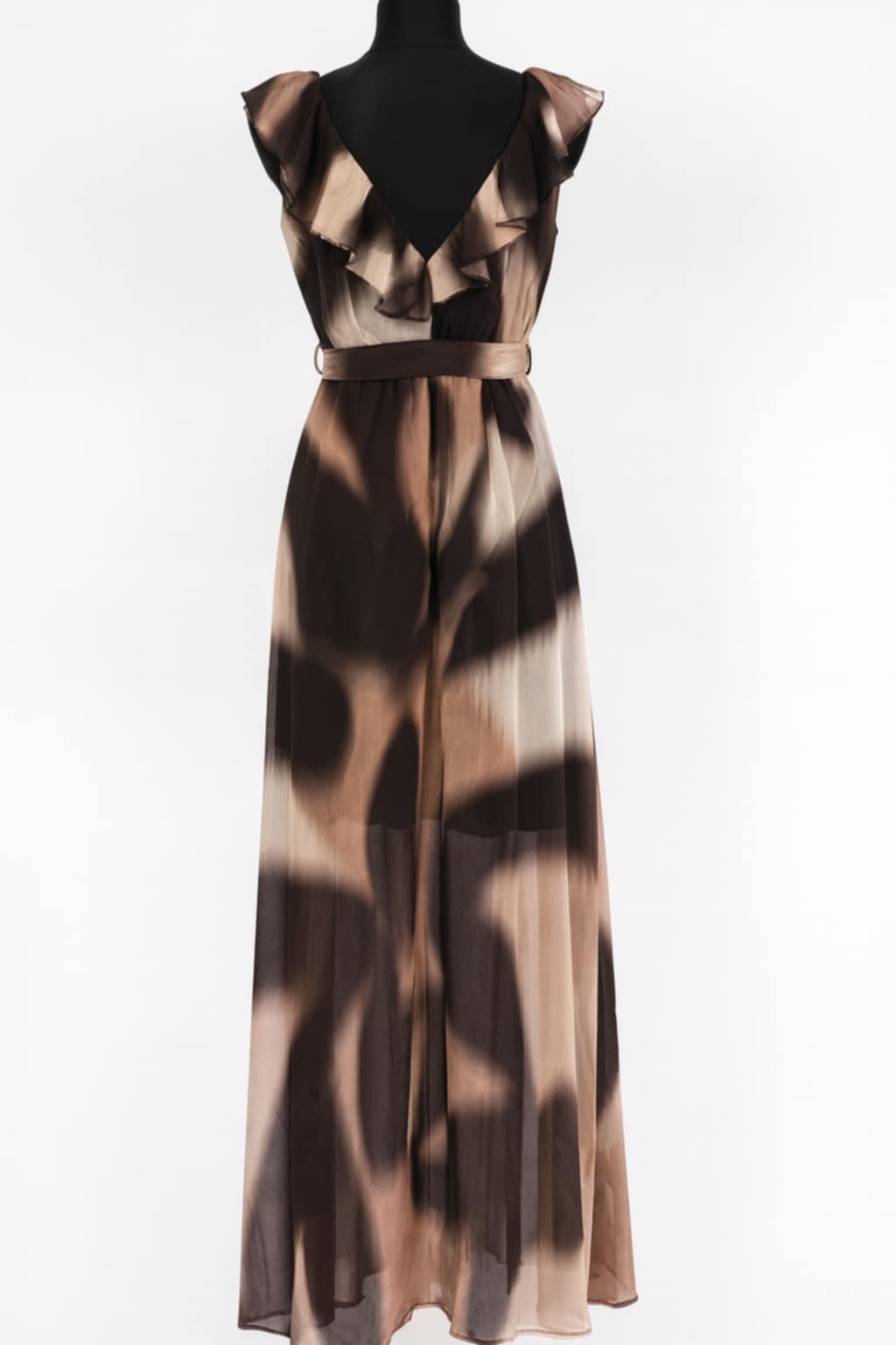 Elegant long sleeveless dress in shades of brown, beige, and black with a subtle artistic pattern. It features a frayed neckline and a matching waistband that accentuates the silhouette. The dress features an elasticated waistband that adapts to the silhouette and highlights the waist. Crafted from a lightweight, flowing fabric, it exudes a refined and feminine charm. Perfect for special occasions.