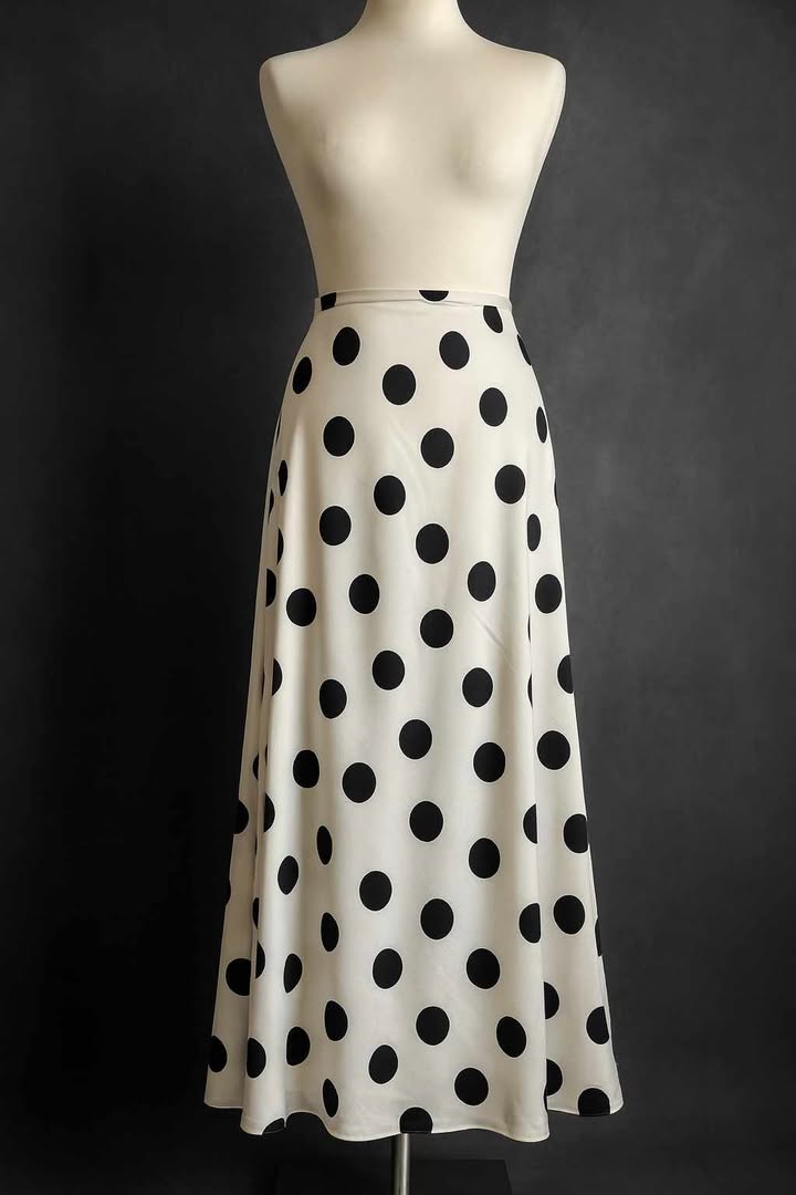 Elegancka, długa spódnica w czarnych groszkach. Wykonanie z lekkiej, subtelnie opadającej tkaniny, opadającej swobodnie w dół. Idealna do letnich stylizacji retro i eleganckich wyjść. Spódnica posiada gumkę w pasie.