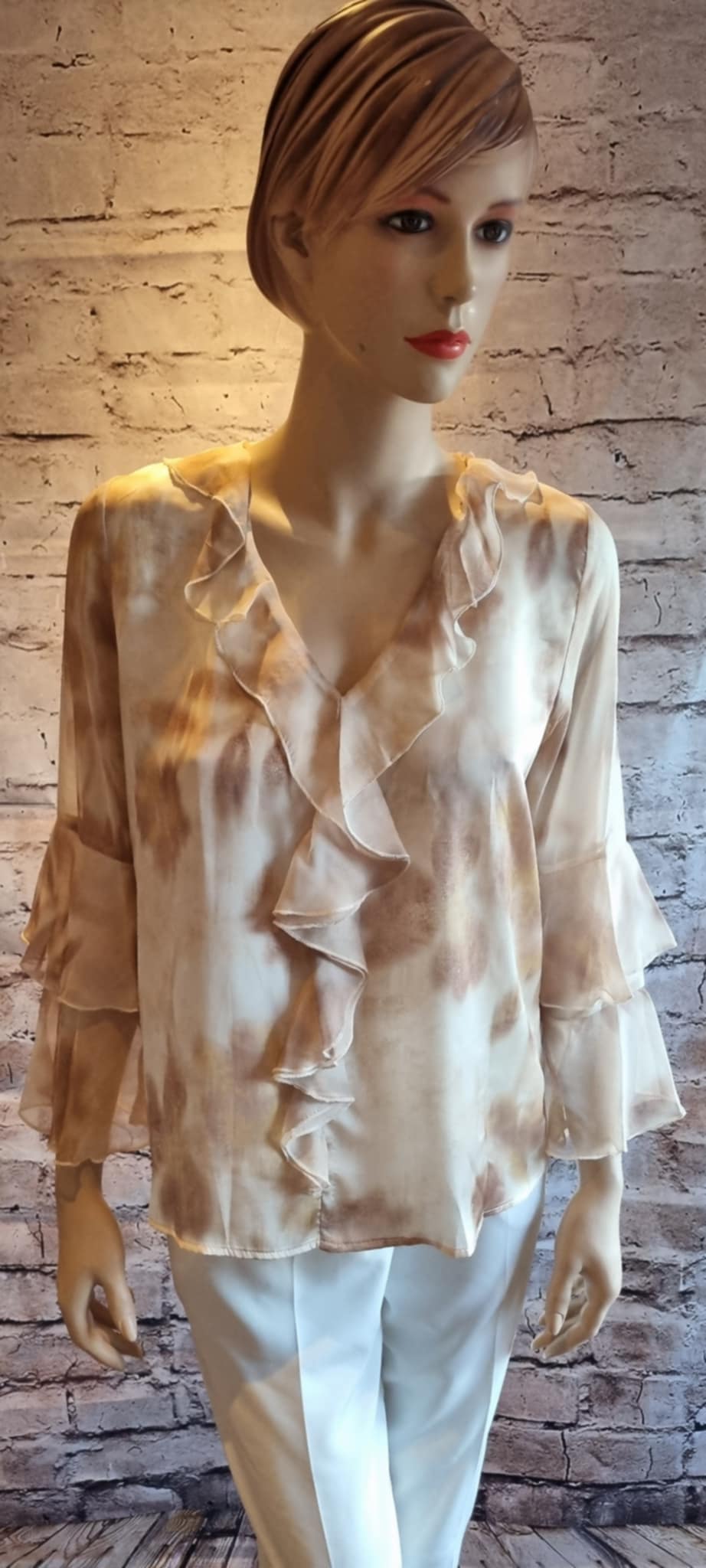 Lightweight, airy blouse in beige tones with a subtle watercolour pattern. Ruffles along the V-neckline and sleeves add an elegant, feminine charm. Made from a delicate fabric that drapes beautifully on the silhouette. Perfect for summer and everyday looks.