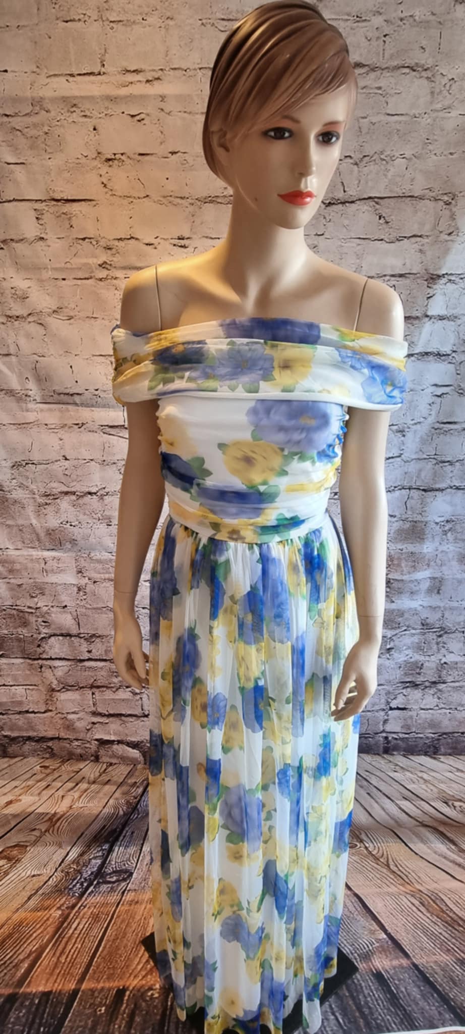 A long, flowing maxi dress with an off-the-shoulder design and a watercolor floral pattern in shades of yellow and blue. The fitted silhouette and lightly pleated skirt give the dress an elegant and airy look, ideal for summer parties and romantic occasions. The dress features an elasticated waistband that adapts to the silhouette and highlights the waist.