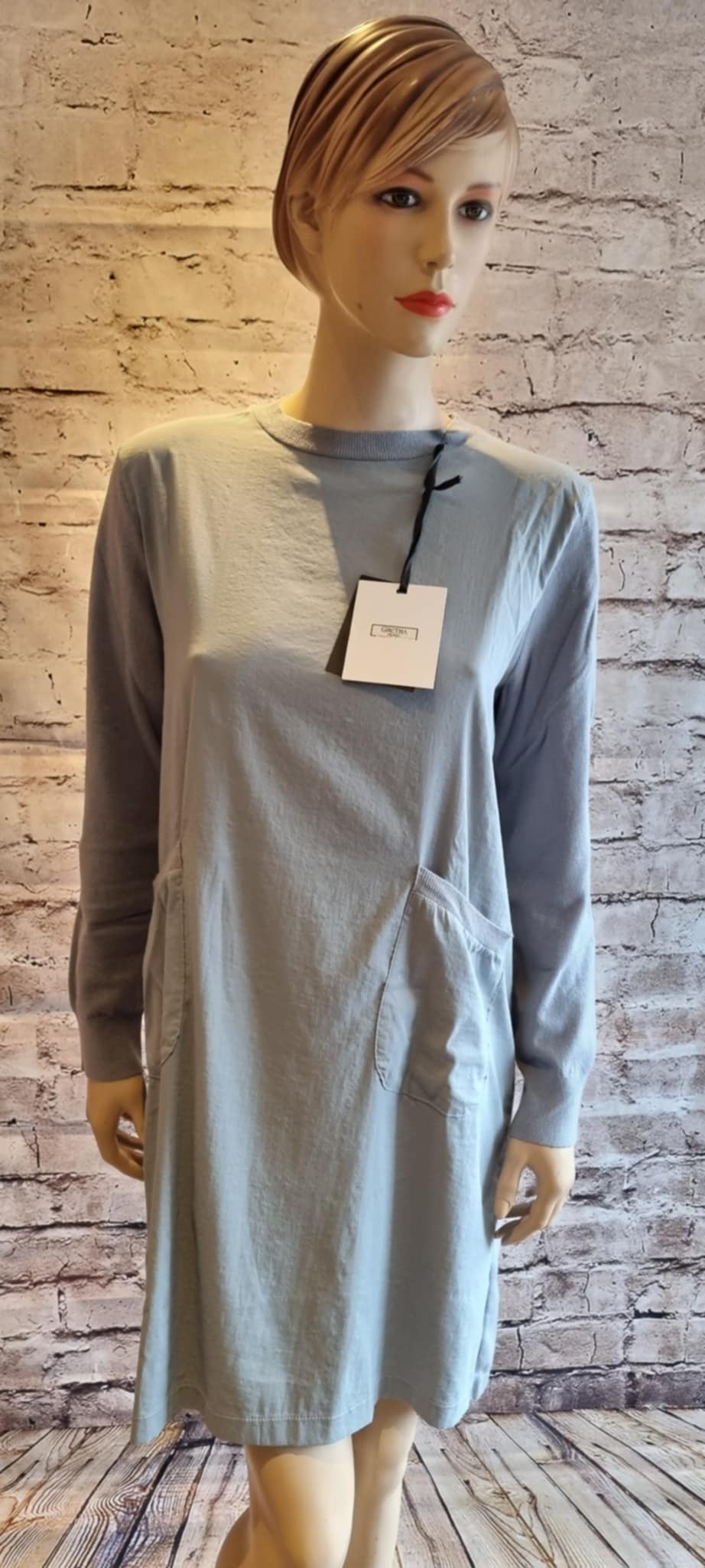 SOFT LINE in the Misty Blue shade is a combination of subtle elegance and top-level comfort. The front is made of smooth, soft jersey fabric, while the back and sleeves are crafted from delicate sweater-knit fabric that moves beautifully with the body and gives the whole piece a luxurious character.