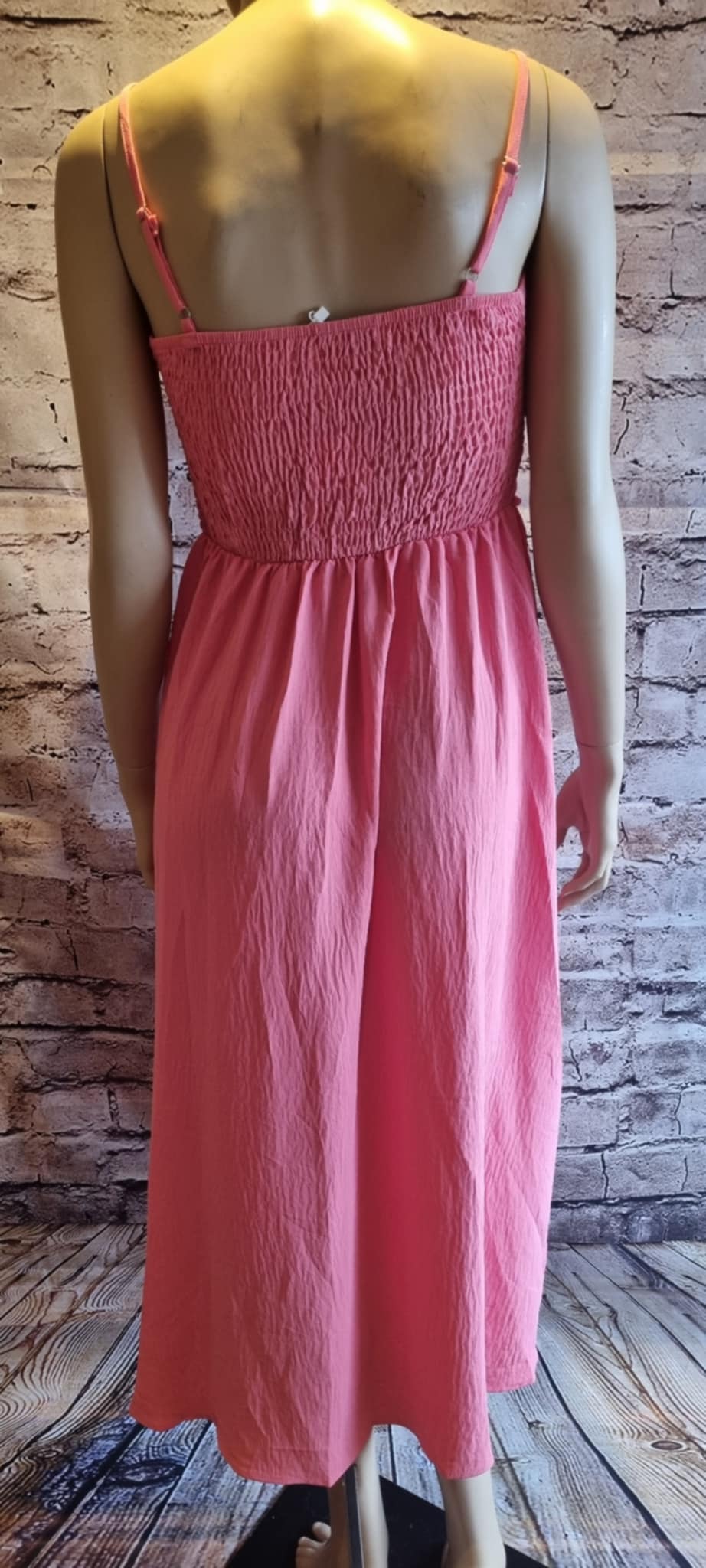 Pink summer dress with thin straps and a loose, airy fit. It features a smocked back for extra comfort. Perfect for warm days and casual outfits.
